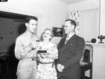 Lieutenant Colonel Thomas I. Ramsey, 29, Marauder bomber, his mother, Mrs. J.M.G. Ramsey, and his father, Reverend Ramsey A tall young man in uniform on the left stands next to a woman with a plate of cake and an older tall man in a double-breasted suit. They are in a house with a darkened room behind them on the left, and behind on the right a small wicker table with framed portraits and a painting on the wall. A curtained window and the edge of a fireplace and mantle are on the right. The window has a pull-down rolled shade, a lacy curtain, and a light background printed drapery over the top. Col. Ramsey is wearing what appears to be a khaki uniform, with a light colored solid tie and a pin on his collar. He is holding a piece of cake. His ecstatic mother is holding a plate of cake and wearing a flower printed dress with a white eyelet collar and tied sash, and is also wearing wire rim glasses and a wristwatch. Rev. Ramsey has a light shirt and diagonal striped tie with his suit and a fob of some sort in his collar button hole. He also is wearing wire rim glasses. Clipping: "Worth coming home for, was the hearty verdict Wedensday of T. Col. Thomas I. Ramsey, 29, Marauder bomber squadron commander on 70 combat missions over Europe, as he sampled a devil's food cake his mother had baked. From left, Colonel Ramsey, his mother and father, Rev. J. G. M. Ramsey." Stamped Star-Telegram Morn Sep 28, 1944.