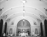 Interior shot of Saint Mary's Catholic Church. The church has a barrel vault ceiling, with hanging-globe lights, decorations of religious statues and paintings. There are medallions seen above the stained glass windows. Published Fort Worth Star-Telegram Morning Edition October 1, 1944.