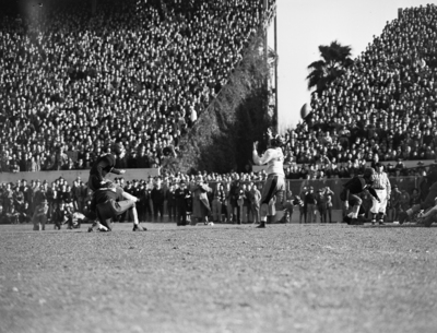 The undefeated Texas A&M Aggies are facing off against the Tulane Green Waves in the 1940 Sugar Bowl. Image is of one of many plays throughout the game leading to the Aggies win. The Aggies went on to win the game by a score of 14-13, securing the title of National Champions. Published in the Fort Worth Star-Telegram morning edition January 1, 1942.