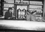 Navy Air Transport Service. War wounded veterans. Mrs. W. K. Stripling (left), chairman of volunteer special services, shown with Mrs. Oliver Shannon (center), airport canteen chairman, and Mrs. E. H. Reed (right), supply chairman. Mrs. Stripling is looking down at a book she is holding. The other two women are back to back to each other. Mrs. Shannon is preparing a drink and Mrs. Reed is handling glasses. Behind them is a wall of shelves with various dishes and cups.