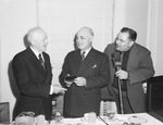 Thomas J. (Tommy) Wallace, left, is a retiring head sheep buyer. He is receiving a watch from A. A. Lund, General Manager of Armour and Company at a banquet held in Wallace's honor at the Hotel Texas. The Man at the right with the microphone was not identified. Mr. Wallace is dressed in a double breasted pinstripe suit. Mr. Lund is wearing a double breasted suit with a handkerchief in the pocket. They are standing behind a banquet table.