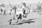 Stopping a SPAAF drive in the first quarter, James Cooper and Norman Cox of Texas Christian University (TCU) tackle Gene LeRoy of South Plains on the Frog 40-yard line after LeRoy had pulled in on of Scat Sullivan's passes, which was good for 40 yards. Alert play like this helped the Frogs to a 34-0 victory. Published in Fort Worth Star-Telegram, morning edition, October 1, 1944.