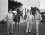 Two British and two United States Army officers and one of the many mules they purchased at Mansfield, Texas, for use as pack animals by the British Army. The officers are, left to right, Major W. B. Bamber (British), Major R. M. Zirkle, Colonel C. A. Wilkinson and Lieutenant Colonel D. A. Green (British). Colonel Green and Major Bamber are of the British Army Veterinary and Remount Service. Wilkinson is commanding officer of the Southwestern area of the Army Remount Services. Major Zirkle is his chief veterinarian. They are all wearing their military uniforms.