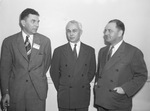 Three new officers for the ensuing year of the American Association of Oilwell Drilling Contractors are left to right: Howard P. Holmes, Carl B. King, and J. E. Warren. Mr. Holmes of Dallas, Texas is president of the Two States Drilling Company. He is dressed in a suit with a name tag. Mr. King, of Midland, Texas, is the vice president for West Texas and New Mexico. He is wearing a double breasted suit. Mr. Warren is dressed in a double breasted suit.