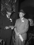 In attendance at the American Association of Oilwell Drilling Contractors Convention are left to right, J. C. Jennings and R. E. Kimsey. Mr. Jennings represented the Jennings Drilling Company of Wichita Falls, Texas. He found the convention was a good opportunity to discuss drilling equipment. Mr. Jennings is dressed in a hat and a double breasted suit. Mr. Kimsey of Midland, Texas, is with the Hughes Tool Company. He is wearing a hat and a suit.