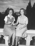 United States Constitution Quiz Contest are studied by two entries from Our Lady of Victory Academy students, left to right, Yvonne Ridings of Waurika, Oklahoma, and Frances Dalton, Graford, Texas. Both ladies sitting outside with books in their hands, as they study the 94 questions in the quiz contest. Published in Fort Worth Star-Telegram.