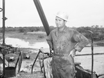 Oil development in Throckmorton County, D. V. Faver, assistant driller. In the picture you can see Mr. Faver wearing a heavy duty overall that is clearly dirty and a helmet, he has his hands on his waist.