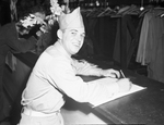 Private Richard E. Kelley, Camp Bowie, signs the register at the Service Men's Center. He is the 100,000th man to request bed accommodations since the center opened on July 3, 1943. Private Kelley is shown leaning over a countertop as he signs the register. He is wearing his military uniform. On the countertop is a bouquet of flowers and to Private Kelley's left is an unidentified man leaning over the counter and an unidentified person on the other side of the counter across from him.