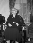 Mrs. Jeannie Holt, daughter of pioneer Tarrant County residents, was honored on 79th birthday anniversary with an informal family dinner and a theater party. Mrs. Holt, born in Cora,Virginia; daughter of Mr. and Mrs. A.C. Beall, who came to Texas from Mississippi. She can be seen to be wearing a long sleeve black dress, eyeglasses, and sitting in a chair.