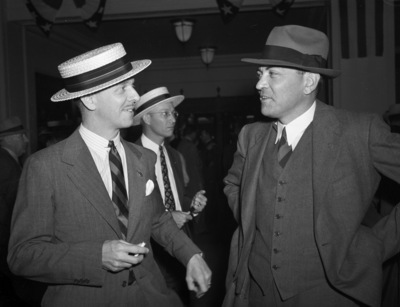 American Petroleum Institute. William Richardson, left, Shell Oil Company, Incorporated, Saint Louis, and F. H. Praeger of Philadelphia. Published morning edition May 28, 1940. Photograph of three men dressed in suits and wearing hats. There are two men in the foreground having a conversation. The other man is in the background.