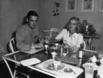 First Lieutenant Raymond Edward Hendricks, B-24 pilot, and wife, the former Miss Martha Teas. Was reported as missing in action in the European theater for two months; he is seen to be enjoying a cup of after dinner. In the picture they appear to be seated at their kitchen table and his wife appears to pour coffee on his mug. Lt. Raymond is wearing his uniform and his wife is wearing a white dress.