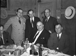 Left to right, Raymond Buck, John Naylor, Colonel Ike Ashburn, Judge Frank Culver and Aubrey Alexander, president of the First Officers' Training Camp Association, friends seen at a luncheon sitting around a table, wearing suits.