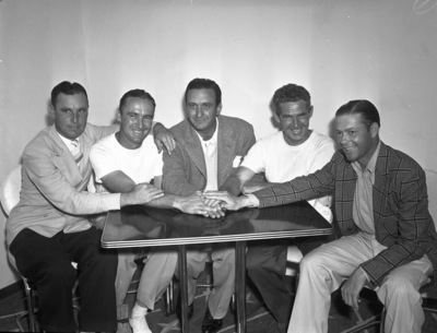 Golfers. Winners of Texas' five places in 1940 National Open; left to right, Zell Eaton of Brownsville; Henry Ransom of Glen Garden, Dick Grout of Wichita Falls; Jack Burke Senior of Houston and W. A. (Lefty) Stackhouse of Sequin, seen sitting around a table each stacking one hand on top of the other.