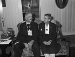 Sam Myers, still has a nostalgic feeling for Fort Worth- the city which was so nervous with "growing pains" in 1890 that it couldn't stand the screeching, whining noise of the machinery in his father's planning mill, so they sold out and moved to San Antonio. His father came to Fort Worth in 1875, while the railroad still was being built toward Fort Worth, meanwhile he had to stay with his mother in Dallas until they officially moved in 1876. In the picture Mr. and Mrs. Sam Myers of San Antonio, they appear to be sitting on a love seat, there is a hallway in the background and further back there are some windows. Mr. Myers appears to be wearing a black suit and Mrs. Myers appears to be wearing a black skirt suit with a white blouse.