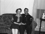 Cecil A. Singleton, Coast Guard Pharmacist's mate first class, is mighty glad to be back home after 18 months on a LST in the South Pacific and Mrs. Singleton, who is taking his place as principal of George Clarke School, smiles her approval too. Mr. & Mrs. Singleton appear to be sitting down on a couch, embracing each other and smiling. He is wearing his uniform and Mrs. Singleton is wearing a plaid collared blouse, blazer, and a skirt.