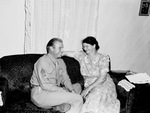 First Sergeant Frank B. Jackson and his mother Mrs. W. L. Jackson appear to be sitting on a couch looking at each other and she has her arm over the superior part of the couch. In the background there is window with a curtain. She is wearing a floral dress and eyeglasses and Sgt. Jackson appears to be wearing his uniform.