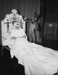 Fort Worth Junior League play scene. In grandmother's room, in the play presented for the children, Mrs. R. J. Hanger is playing as grandmother; and Mrs. G. R. Thomas, is playing the wolf. They are on a stage. The grandmother is sitting up in a bed and reading. She is wearing a sleeping cap and nightgown. Mrs. G. R. Thomas is wearing a wolf costume and standing behind the grandmother. Published in Fort Worth Star-Telegram morning edition, October 29, 1944.