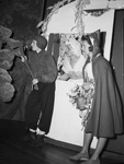 Fort Worth Junior League play scene. In a modern version of "Little Red Riding hood" and the players are, Mrs. Jack Gaither, left; Mrs. C. Reynold Weaver, center; and Mrs. E. A. Bosl, Junior (Jr.), right. Mrs. Gaither is playing as huntsman, holding an axe and smoking a pipe. Mrs. Weaver is playing the mother. She is leaning out of a window wearing a lace cap and a lace collar. The woman next to her is wearing a hooded cape and holding a basket of flowers is Mrs. Bosl, Jr. who is the heroine in this play. Published in Fort Worth Star-Telegram morning edition, October 29, 1944.