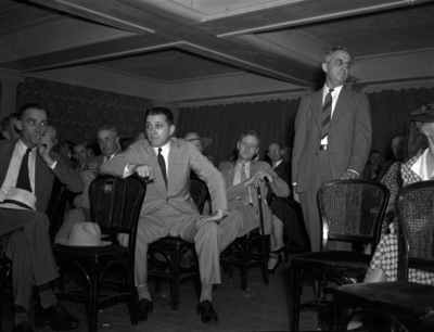 State Democratic convention. In Waco, Texas. Fred Rucker of San Antonio, seated, left, and J. Ira Kirchenville of San Antonio, Texas, standing, right. All men are seen either sitting or standing in an office as they listen on at the convention.