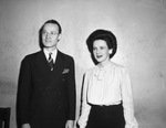 Howser Zumwalt and Miss Joy Moore will play the leading roles in the Footlite Club's production of "Where the Heart Is," to be presented at the First Methodist Church banquet hall. They are standing in front of a bare wall. Mr. Zumwalt is wearing a suit and eyeglasses and Miss Moore is wearing a blouse, skirt and earrings.