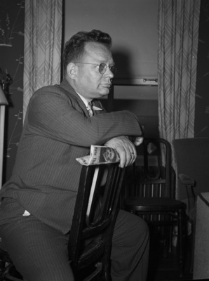 State Democratic convention. In Waco, Texas. Maury Maverick, San Antonio mayor, seen sitting down backwards on a chair in a an room.