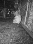 "Butch" the lion cub has returned to the Forest Park Zoo after fifteen months of service. Butch became a "lion pilot" with the Army Ferrying Command in Fairfax, Kansas at five months old. But Butch is no longer a little cub. According to zookeeper Julian Frazier, Butch is at just the right age to get sassy. After biting an officer, Butch was discharged from the Army. Butch is sitting at the back of his cage watching patrons of the zoo pass by.