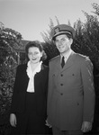 Ensign and Mrs. John Franklin Adkins recently were married in Roswell, N.M. The bride is the former Miss Betty Hannifin, daughter of Mr. and Mrs. S.P. Hannifin of Roswell. The couple have gone to Miami, Florida where he will be stationed. In the picture they both appear to be posing in a garden, there is a lot of foliage behind them. Mr. Adkins appears to be wearing his uniform and Mrs. Adkins is wearing a suit skirt with a white collared shirt.
