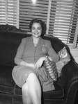 Mrs. M. D. Clubb of Stillwater, Oklahoma is the house guest of Prof. and Mrs. Gayle Scott. Professor Clubb is head of the English Department at Oklahoma A &M College, and formerly was a member of the TCU faculty. In the picture you can see her sitting down on a couch wearing a long sleeve dress, smiling, with her right leg crossed over her left one, and resting her arm in one of the couch pillows.