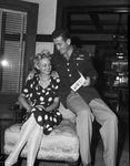 Major Alfred E. Coffey, home on leave after 32 months in the Southwest Pacific , shows his wife the Silver Star he was awarded for gallantry in action on Biak where he served as intelligence officer with the infantry. In the picture you can see both of them smiling, Maj. Coffey is sitting on the couch arm, and he has his arm over his wife, his wife appears to be sitting on the couch and she is wearing a floral patterned dress, stockings, and a pearl necklace.