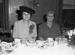 Mrs. Alfred Taylor, left, state director of education and organization for the Democratic Party, and Mrs. Eula Bates, president of the Tarrant County Democratic Woman's Club, at the club's luncheon at Hotel Texas. Both women are sitting in front of the dinner table wearing dresses and hats. Mrs. Taylor is wearing a corsage. The table they are sitting in front of has cut fruit, pies, crackers and a variety of tableware. Published in the Fort Worth Star-Telegram morning edition, October 20, 1944.