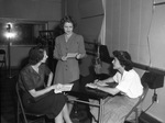Junior League group planning radio program. Working out plans for the forthcoming radio program, to be coordinated with the art course, are, left to right, Mrs. DeWitt Neighbors, Mrs. J. E. Hill and Miss Caroline Collins. The radio program will be on Mexico. Mrs. Neighbors is wearing a hat and has her handbag in her lap. She is sitting in a chair and pointing to a piece of music. She is looking at Mrs. Hill who is standing next to her. Mrs. Hill is looking at a piece of paper she is holding in her hand. Miss Collins is sitting at a table holding a pen. She has a microphone in front of her. The three women appear to be in a recording studio. Published in Fort Worth Star-Telegram morning edition, October 29, 1944.