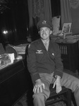 Lieutenant J. S. McMinn, P-47 Thunderbolt pilot. McMinn is a former alumni of North Side High and Texas Christian University (T.C.U.). He appears to be wearing his combat jacket the winged silver boot of the "Late Arrivals Club," composed of pilots who "walked back." In the background there are two desks with a lot of stuff such as books, maps, and papers on top .