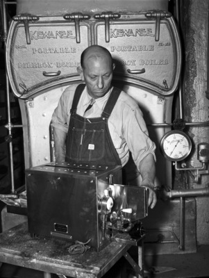 Henry A. Brown, chief engineer at the Worth Hotel, spent so much time repairing and reconditioning old toasters used by the hotel during the past 12 years he decided he'd invent one. He is shown with the toaster he invented.
