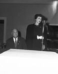 Governor Stevenson may get the Texas Regulars' electoral votes for vice president if the Regulars carry the general election and find they hold the balance of power in the electoral college voting for president and vice- president. Mrs. F. R. Carlton of Dallas, co- chairman of the party's Dallas County organization and elector nominee, at the microphone, and J. Hart Willis of Dallas, at her left side sitting down. Mrs. Carlton appears to be wearing a black dress, a long black coat, white gloves, a pearl necklace, eyeglasses, and a hat. Mr. Willis appears to be wearing a suit, a patterned tie, and a white collared shirt.