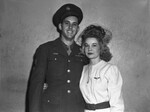 Technical Sergeant and Mrs. Thomas H. Cox recently married in Weatherford. The bride is the former Miss Doris Ann Smith. The bride wore a white wool dress with black lizard bag and shoes, purple accessories and a corsage of purple orchids. The couple will leave for Miami Beach, Fla., where Sgt. Cox will be reassigned. He just returned home from six months of service with the AAF in Europe, where he was awarded two battle stars, the Air Medal with two clusters, and a presidential unit citation. In the picture both appear to be standing in front of a wall and embracing each other. Sgt. Cox appears to be wearing his AAF uniform and Mrs. Cox is wearing a white dress, with a belt, an Air Force pin on her left side, and a hat.