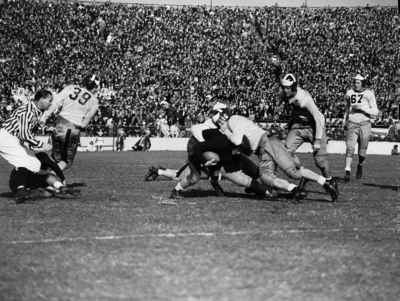 The undefeated Texas A&M Aggies are facing off against the Tulane Green Waves in the 1940 Sugar Bowl. Image is of one of many plays throughout the game leading to the Aggies win. The Aggies went on to win the game by a score of 14-13, securing the title of National Champions. Published in the Fort Worth Star-Telegram morning edition January 1, 1942.