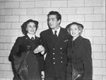Chief Boatswain's Mate Victor Mature, star of the Coast Guard revue, "Tars and Spars" is pictured with two Texas members of the cast, Mary Martino, left, Seaman Second Class and Nell Keith, Seaman First Class. On their arrival at T &P Station in Fort Worth , the show opened a six day engagement on the stage of the Worth Theater.