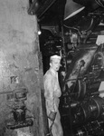 Star-Telegram Junior. Sid Thompson, is in a mechanical room standing next to the printing press. He is wearing a mechanical uniform and holding a tool in his right hand, and has a cigarette in his mouth.