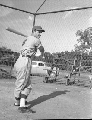The Fort Worth Cats signed local sandlot player Wyman Hunnicutt on Sunday. Hunnicutt is a nineteen year old third basemen. He spent a few games in the East Texas League earlier this season. He is standing on the left side of the plate, wearing number 6 on the back of his jersey. He is swinging a Louisville Slugger. There is an automobile parked behind the backstop and the bleachers.