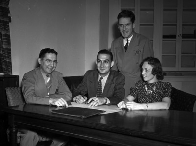 Footlite Club committee members include Charles Tate, seated, left, retiring president; Ed Eckert, center, the new president; and Maybell Criner, first vice president. Standing is W. L. Bragg, second vice president, all gathered around a table signing and going through paper work.