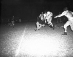Polytechnic High School football vs North Side, action shot. Halfback J. D. Peacock of Poly charges into fullback Dewey Jacobs of North Side as the Steer backfield ace winds up a nine-yard gain on the Poly 11 in the second quarter of Friday night's crucial 7-AA game at Farrington Field. North Side's Raymond Walker (68) is in the background, while Poly's Dick Wentworth is on the ground behind Jacobs. North Side won, 13-7. Published Fort Worth Star-Telegram Morning Edition November 4, 1944.