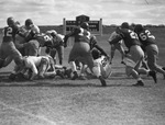 Football Texas Tech and Texas Christian University action shots: Fullback Norman Cox of Texas Christian University (TCU) plows through the center of the Texas Tech line for the Frogs' first touchdown in the initial period of Saturday's game at TCU Stadium. Cox went over from the one-yard line after ground plays and aerials had moved the ball into scoring position on the Tech 5, Norman also chalked up TCU's second counter in the third period to give the Frogs a 14-0 victory over the Red Raiders. Published in the Fort Worth Star-Telegram morning edition, November 12, 1944.