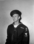 Thomas Howard Randles is a Storekeeper Third Class in the United States Navy. He is home on rotational leave, visiting his mother, Mrs. H. A. Moore. Randles holds a gun position on the ship during combat and saw action in Saipan. After his leave, he will report to Norfolk, Virginia, for reassignment. He is shown standing against a wall, dressed in his military uniform.