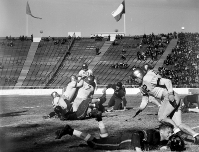 The Boston College Eagles and the Clemson Tigers are facing off in the 1940 Cotton Bowl. Action play. One of the players has been hit and has lost his helmet as he landed on the ground.