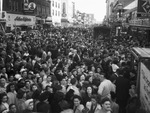 The crowd breaks at Seventh and Houston, in Fort Worth, Texas, at the close of the well attended Sixth War Loan drive parade. The streets were packed however Police said not a single accident marred the parade, which was held under ideal weather conditions. Published in the Fort Worth Star-Telegram morning edition, November 21, 1944.