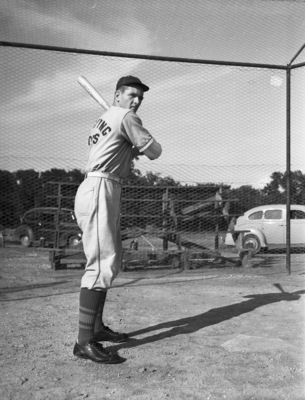 One of the best southpaw hitters in Fort Worth, Texas, amateur baseball this year is the Kids' steady first baseman, Richard Allen, who played the same position for Texas Christian University (TCU) last spring. Allen is standing at the bat, ready to swing, and is wearing his baseball uniform.
