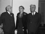 At the Texas State Teachers Association Meeting at Hotel Texas, the past Presidents were honored. Among the past president attendees are left to right, J. F. Kimball, oldest living past president, Miss Lela Williams, and W. L. Hughes. The men are both wearing pin-striped suits. Miss Williams is wearing a dark colored outfit with a coat over it. The coat has a bow shaped pin on it. Members of the organization were urged to participate in the five-year program of unification, expansion and development of local, state and national teachers association. Published in the Fort Worth Star-Telegram morning edition, November 25, 1944.