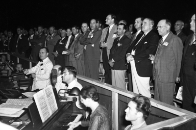 Musicians play in the pit while men standing behind them, looking on. This picture was captured at the American Petroleum Institute party at Shady Oak Farm.