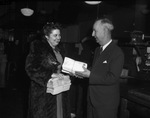 Tarrant County Tuberculosis Soceity. Mrs. Glenn Rothelle delivering letters to Postmaster H. D. Young. A woman handing a man a stack of envelopes. The man is also holding a stack of envelopes.