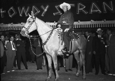 Spectators watch as smiling man sits on a horse. This picture was captured at the American Petroleum Institute party at Shady Oak Farm.